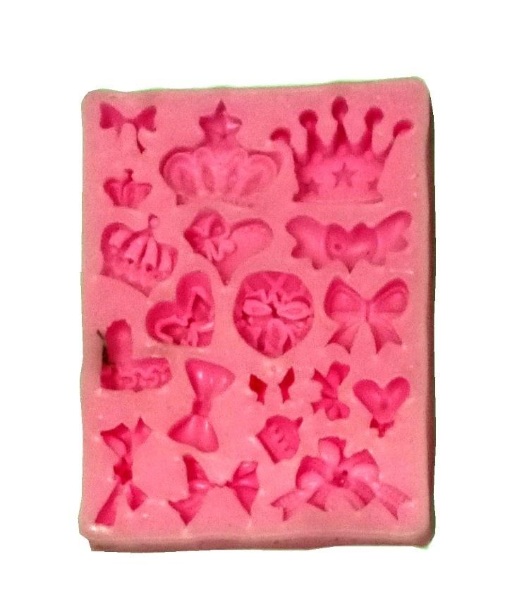 Forma silikonowa wielkości 8,5 cm x 7 cm do odlewów z gipsu, mas plastycznych, plasteliny, modeliny, mas cukierniczych itp.Z formy jest możliwość odlania lub stworzenia 19 elementów w kształcie kokardek, koron itp