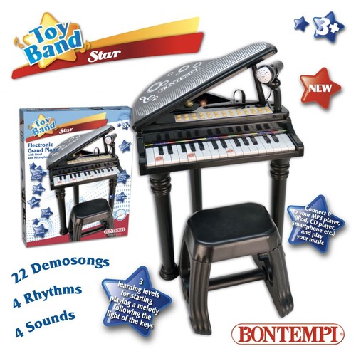 Fortepian elektroniczny włoskiej firmy Bontempi, to wymarzona zabawka młodego pianisty. Instrument zawiera: 31 klawiszy z funkcją podświetlania do nauki gry, 22 melodie, 4 rodzaje dźwięków, 4 rytmy, gniazdo MP3 (przewód w zestawie), mikrofon oraz stołek. Wymiary produktu 35 x 31 x 53cm. Zasilanie 4xR6/AA 1,5V (nie dołączono do zestawu).
