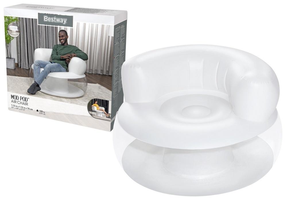 Dmuchany Fotel Biały 112 x 112 x 70 cm Bestway 75138 Dmuchany fotel Bestway to wygodne i stylowe siedzisko idealne do użytku w domu i na świeżym powietrzu. Dzięki ergonomicznej konstrukcji i flokowanej powierzchni zapewnia komfortowy wypoczynek, a solidne materiały gwarantują trwałość i wygodę. Został wykonany z wytrzymałego PVC, co zapewnia długotrwałe użytkowanie i komfort siedzenia. Dzięki składanej konstrukcji jest łatwy do przechowywania i transportu, co sprawia, że doskonale sprawdzi się w sypialni, salonie czy domowym barze. Nowoczesny design fotela umożliwia szybkie napompowanie przy minimalnym wysiłku. Kompaktowa forma pozwala na ustawienie go w dowolnym miejscu, co jest idealnym rozwiązaniem dla osób ceniących wygodę i elastyczność. Wymiary fotela : 112 x 112 x 70 cm Maksymalne obciążenie: 100 kg Wymiary opakowania: 44 x 44 x 28 cm