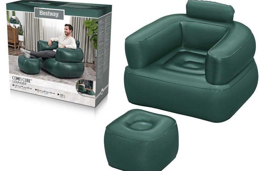 Dmuchany Fotel Ciemny Bestway 75137 Dmuchany fotel Bestway to wygodne i stylowe siedzisko idealne do użytku w domu i na świeżym powietrzu. Dzięki ergonomicznej konstrukcji i flokowanej powierzchni zapewnia komfortowy wypoczynek, a solidne materiały gwarantują trwałość i wygodę. Został wykonany z wytrzymałego PVC, co zapewnia długotrwałe użytkowanie i komfort siedzenia. Dzięki składanej konstrukcji jest łatwy do przechowywania i transportu, co sprawia, że doskonale sprawdzi się w sypialni, salonie czy domowym barze. Nowoczesny design fotela umożliwia szybkie napompowanie przy minimalnym wysiłku. Kompaktowa forma pozwala na ustawienie go w dowolnym miejscu, co jest idealnym rozwiązaniem dla osób ceniących wygodę i elastyczność. Wymiary fotela : 107 x 99 x 80 cm,