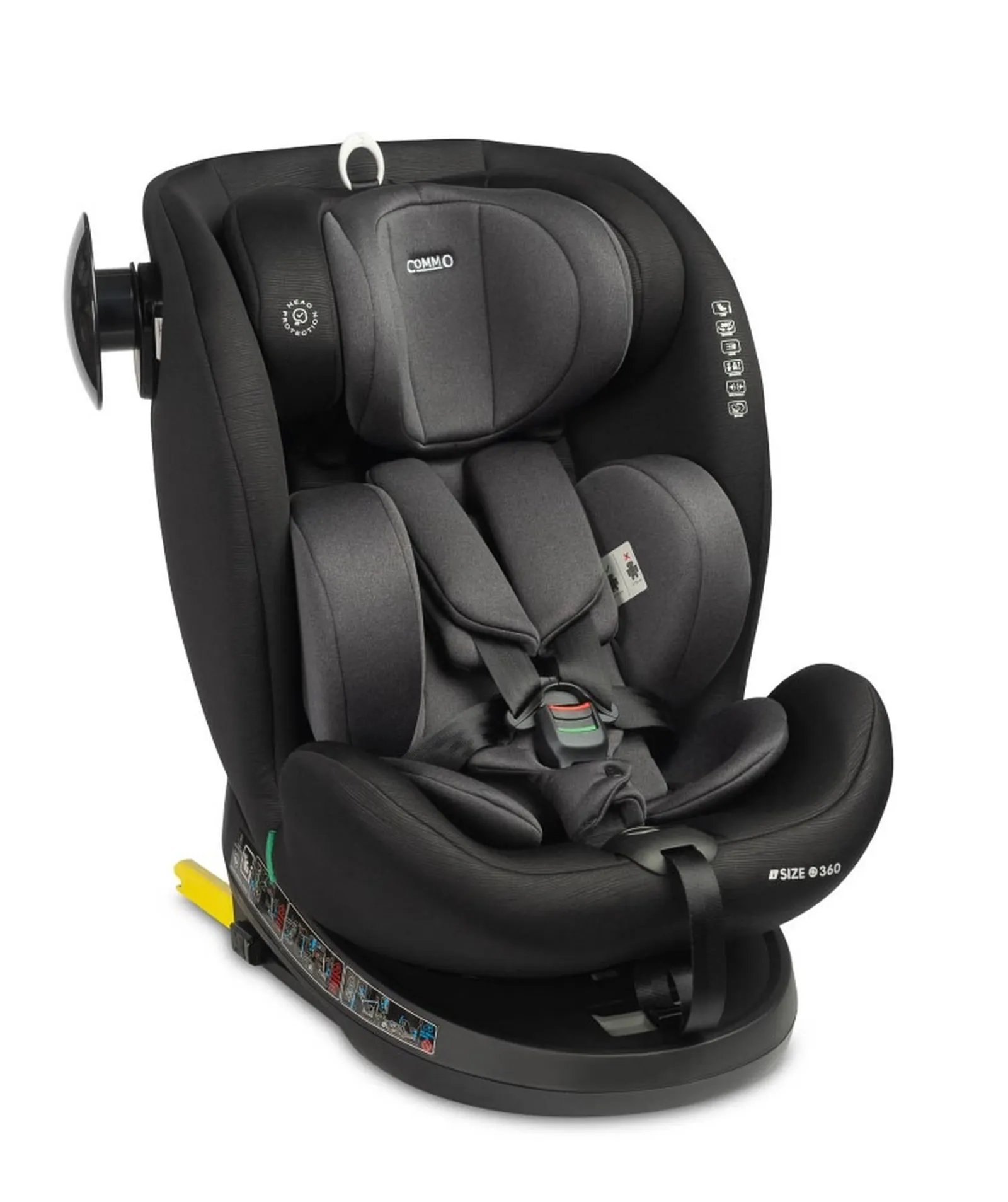 Caretero COMMO to nowoczesny fotelik samochodowy z wymagającą homologacją i-Size. Fotel jest przeznaczony dla dzieci od pierwszych miesięcy życia (od 40 cm) aż do momentu, w którym fotelik nie jest już wymagany, czyli osiągnięcia 150 cm wzrostu. Montaż w samochodzie jest bardzo łatwy i szybki dzięki zaczepom ISOFIX oraz pasowi TopTether z dodatkową klamrą z sygnalizacją dźwiękową. Siedzisko z możliwością obrotu 360 stopni gwarantuje wygodę umieszczania dziecka w foteliku. Komfort najwyższej klasy jest zapewniany przez wygodną wkładkę z regulowanym zagłówkiem. Tapicerka została wykonana z wysokiej jakości tkaniny poliestrowej gwarantując dziecku wygodę jazdy. Dzięki wielostopniowej regulacji zagłówka fotelik może być idealnie dopasowany do wzrostu dziecka, zapewniając prawidłowe podparcie okolic szyi i głowy. Commo posiada 5 stopni pochylenia zarówno w pozycji przodem, jak i tyłem do kierunku jazdy. Klamra 5-punktowych pasów fotelika została wyposażona w sygnalizator dźwiękowy, który zacznie piszczeć w momencie ich rozpięcia. Dodatkowym atutem jest boczna nakładka SIP (Side Impact Protection), która umieszczona na bocznej ściance fotelika gwarantuje zwiększone bezpieczeństwo w przypadku kolizji drogowej.