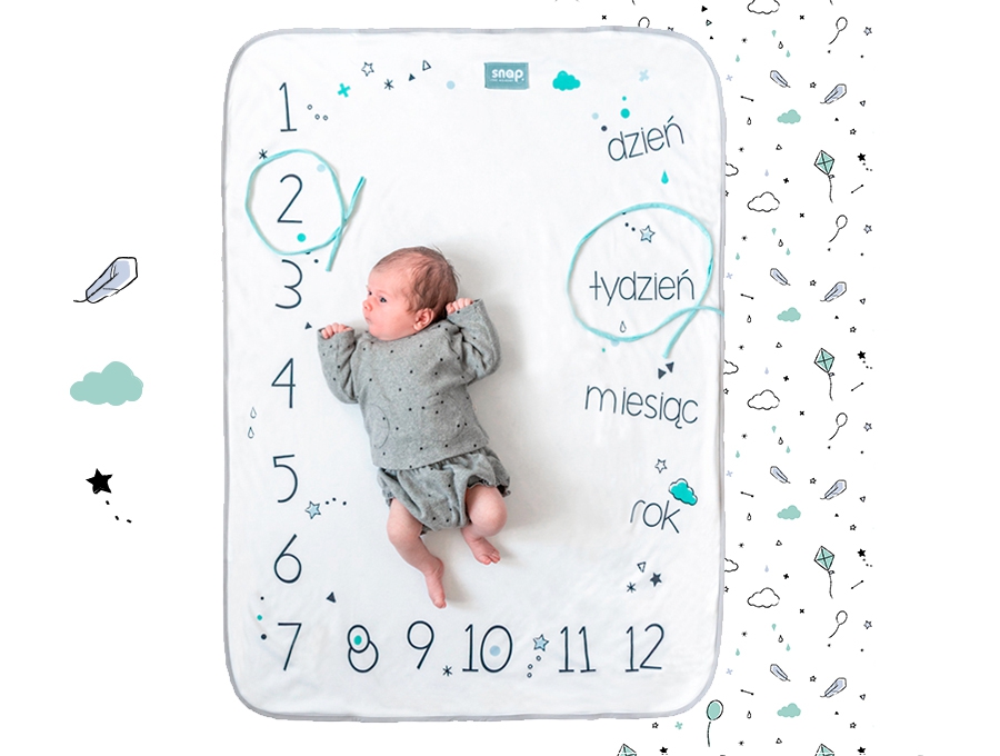 Snap the moment foto-kocyk® to dwustronny kocyk, który rośnie razem z dzieckiem. Jedna strona służy do oznaczania wieku malucha, druga to tradycyjny kocyk dziecięcy. Pastelowe wzory zachwycą zarówno dziecko, jak i rodziców. Foto-kocyk® doskonale sprawdzi się jako element wyprawki noworodka, a także kocyk przedszkolaka. W zestawie znajdują się 2 sznurki do oznaczania wieku maluszka oraz limitowana foto-karta.
