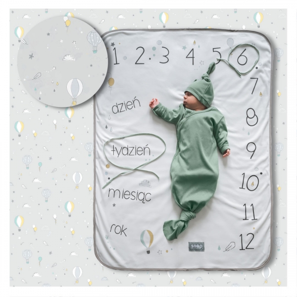 Opakowanie zawiera: dwustronny kocyk, 2 sznurki do oznaczania wieku, Snap the moment foto-kartę.
