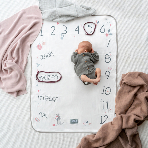 Snap the moment foto-kocyk® to dwustronny kocyk, który rośnie razem z dzieckiem. Jedna strona służy do oznaczania wieku malucha, druga to tradycyjny kocyk dziecięcy. Pastelowe wzory zachwycą zarówno dziecko, jak i rodziców. Foto-kocyk® doskonale sprawdzi się jako element wyprawki noworodka, a także kocyk przedszkolaka. W zestawie znajdują się 2 sznurki do oznaczania wieku maluszka oraz limitowana foto-karta.
