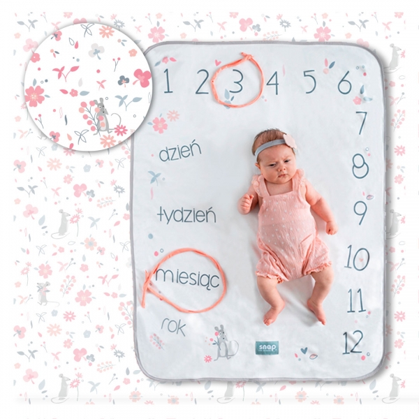 Opakowanie zawiera: dwustronny kocyk, 2 sznurki do oznaczania wieku, Snap the moment foto-kartę.