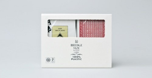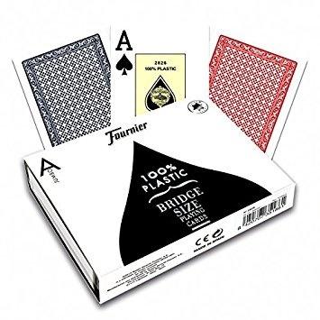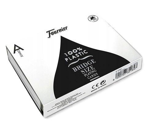 Komplet dwóch 100% plastikowych talii kart w wymiarze bydżowym, Talia zawiera 55 kart o wymiarach 57 x 88 mm. Każda karta zbudowana z 4 warstw (PCV - plastik, warstwa nadrukonośna oraz 2 warstwy lakieru specjalnej formuły) gwarantuje wytrzymałość i zapewnia najlepsze doznania podczas gry. Karty Fournier opierają się nieokreślonej ilości odkształceń (np. poprzez wyginanie) i zawsze wracają do swojego pierwotnego kształtu. Nie zużywają się jak zwykłe karty. Pokryte są specjalną warstwą lakieru, która zapewnia niespotykaną gładkość i przyjemność w dotyku. Są odporne na wilgoć, odporne na rozdzieranie, nieprzeźroczyste, nie ulegają wyblaknięciu. Każda talia jest zafoliowana oraz sygnowana hologramowym paskiem ochronnym potwierdzającym oryginalność produktu.