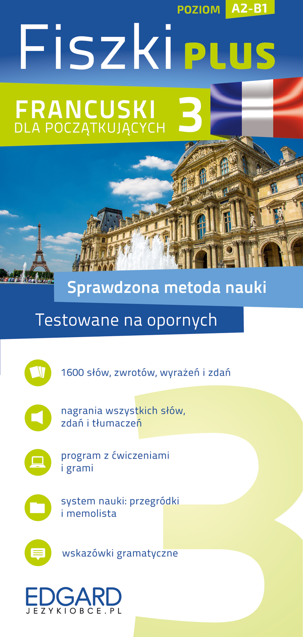 Francuski Fiszki PLUS dla początkujących 3 (A2-B1) to pakiet 600 fiszek będący częścią rozbudowanego systemu nauki, dzięki któremu szybko i skutecznie nauczysz się słownictwa na poziomie początkujacym i średnio zaawansowanym. Fiszki PLUS to starannie przygotowany materiał, wysokiej jakości nagrania wymowy wraz z programem komputerowym, memolistą i grami językowymi.