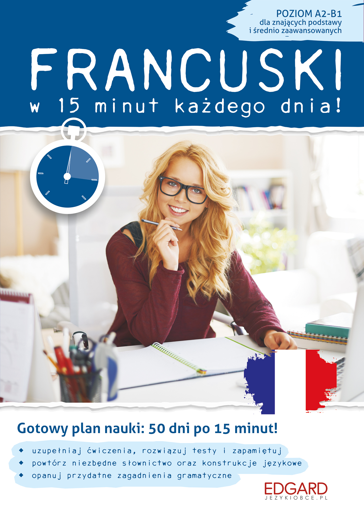Francuski w 15 minut każdego dnia dla znających podstawy i średnio zaawansowanych (A2-B1) to wyjątkowy kurs do nauki języka francuskiego przeznaczony dla wszystkich, którzy mają mało czasu na naukę, a chcą poznać nowe słownictwo oraz utrwalić zagadnienia gramatyczne. Różnorodne zadania, ćwiczenia i łamigłówki uatrakcyjniają naukę i sprzyjają zapamiętywaniu.