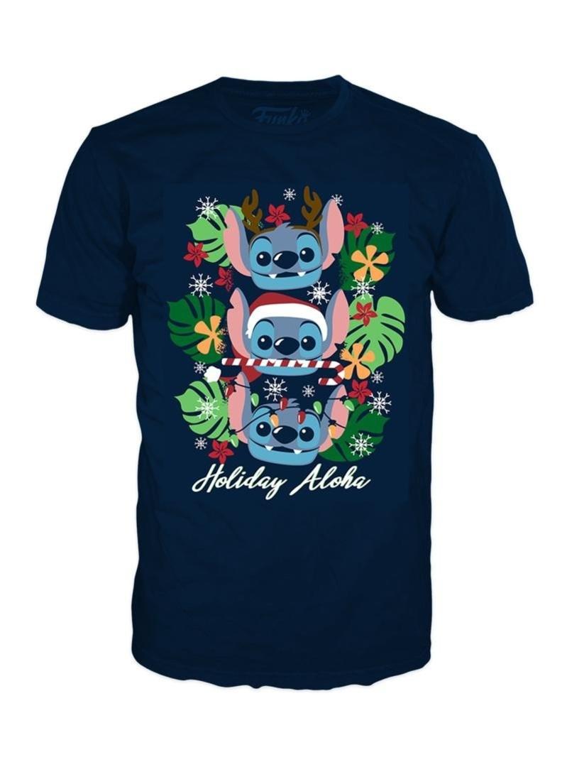 Granatowy t-shirt Disney z motywem Stitch w świątecznej odsłonie. Na przodzie znajduje się kolorowa grafika przedstawiająca Stitcha z rogami renifera i czapką Mikołaja w otoczeniu śnieżynek i tropikalnych liści. Koszulka wykonana z miękkiego materiału zapewniającego komfort noszenia. Idealna dla fanów Disneya oraz jako oryginalny prezent świąteczny.