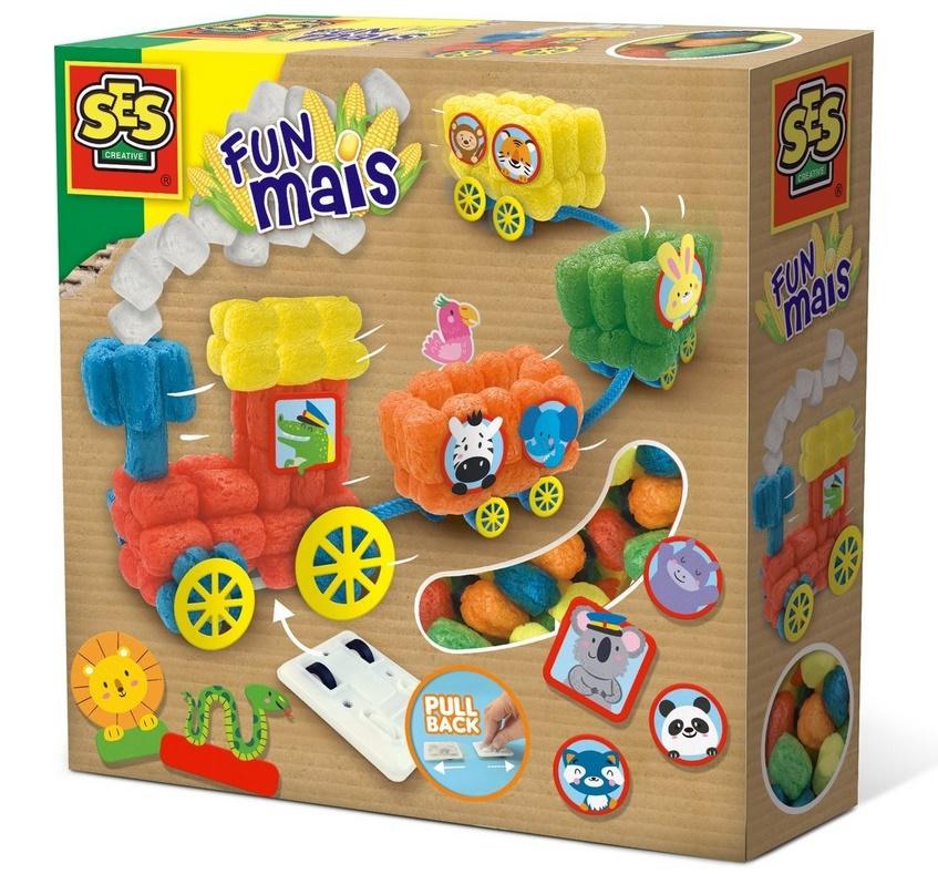 Dzięki temu zestawowi do tworzenia możesz zbudować prawdziwy pociąg z Funmais. Postępuj zgodnie z instrukcjami krok po kroku, aby stworzyć zabawny pociąg z Funmais i wydrukowanymi szczegółami. Przymocuj pociąg i wagony. Napęd przyklej pod lokomotywą. Pociąg Funmais jest gotowy do pracy. Cich… ciuch! Nie wymaga baterii. Nie potrzeba kleju! FunMais są tworzone z naturalnej skrobi kukurydzianej i barwników spożywczych. To w pełni bezpieczna i ekologiczna zabawa umożliwiająca dziecku budowanie przestrzennych form - wystarczy tylko lekko zmoczyć "chrupki" FunMais i połączyć je ze sobą.