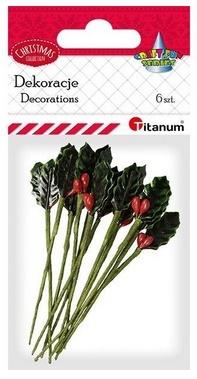 Gałązki ostrokrzewu wyglądające jak prawdziwe. Na każdym druciku 1 listek z owocami. Wymiary gałązki: 15 x 30 mm. Kolor: zielono-czerwone. 6 szt.