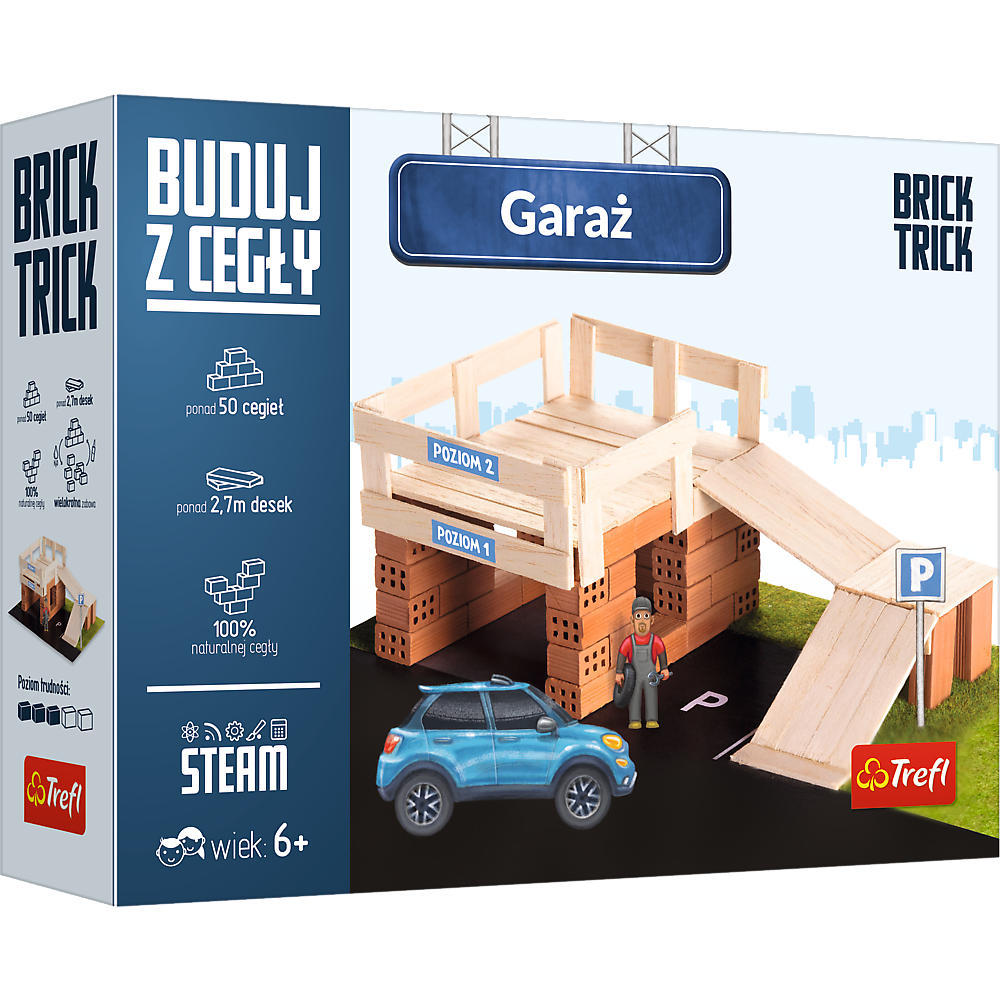 Wybuduj garaż dwupoziomowy, wykorzystując prawdziwe cegły, drewno i elementy dekoracyjne. Skorzystaj z dołączonych planów budowy lub użyj wyobraźni do stworzenia niepowtarzalnej konstrukcji. Baw się dołączonymi pionkami prosto z miejskiego świata! Rozpuść konstrukcję w wodzie i buduj dalej wykorzystując ponownie te same cegły! Zestaw zawiera: prawdziwe cegły, klej, drewniane deseczki, elementy dekoracyjne, pionki, podstawkę, naklejkę, instrukcję. Wiek 6+