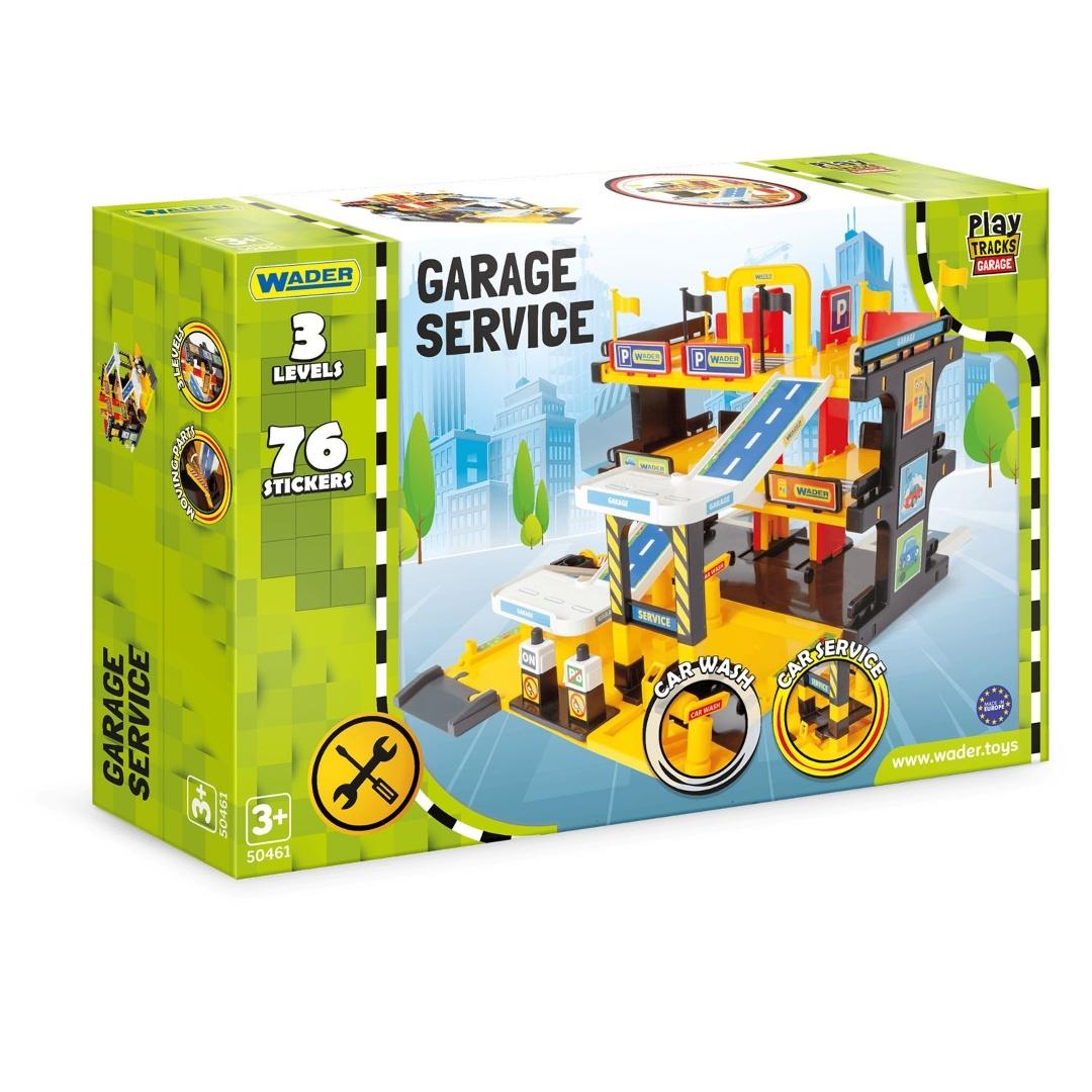 w skład zestawu wchodzi: winda transportująca samochody na dowolny poziom, rampa, myjnia samochodowa, dystrybutor paliwa, serwis samochodowy, liczne dekoracje oraz naklejki