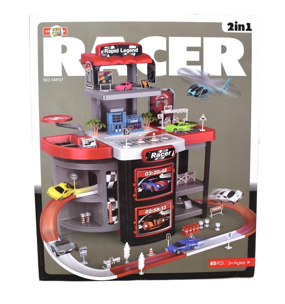 Rozbudowany garaż o tor wyścigowy to masa frajdy dla każdego dziecka. Aż 6 sportowych aut znajdujących się w zestawie może stanąć do wyścigu, którego trasa przebiega nawet przez wnętrze garażu, a zwycięzca stanie na podium na samym szczycie garażu. Nad bezpieczeństwem uczestników czuwa helikopter, który w każdej chwili może wylądować na specjalnym lądowisku.