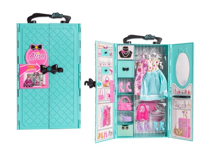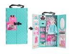 Garderoba to niezbędny mebelek dla lalek, który uporządkuje wszystkie akcesoria. Otwierana, pojemna szafa wyglądem przypomina prawdziwą- posiada drążek z wieszakami, półeczki oraz lusterko z półką na biżuterię.Garderoba wykonana jest w niebieskiej kolorystyce, posiada pikowanie na drzwiach oraz zamek zabezpieczający przed otwarciem.
