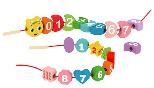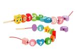 w drugim woreczku znajdziemy około 80 centymetrowy sznurek zakończony z jednej strony drewnianym wałkiem, a z drugiej klasyczną przeźroczystą owijką, taką jak sznurówka. Każdy klocek jest winnym kolorze, kształcie i przedstawia inną cyfrę. Cyfry odpowiadają ilości elementów na odwrocie klocka.