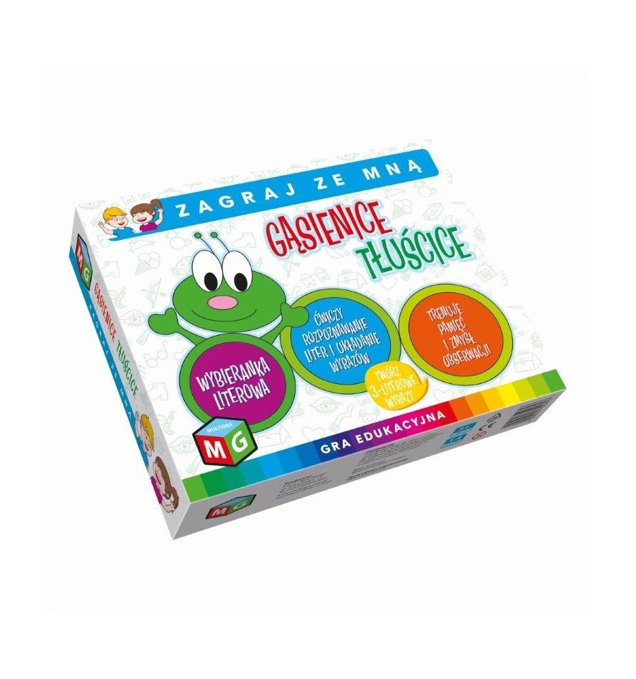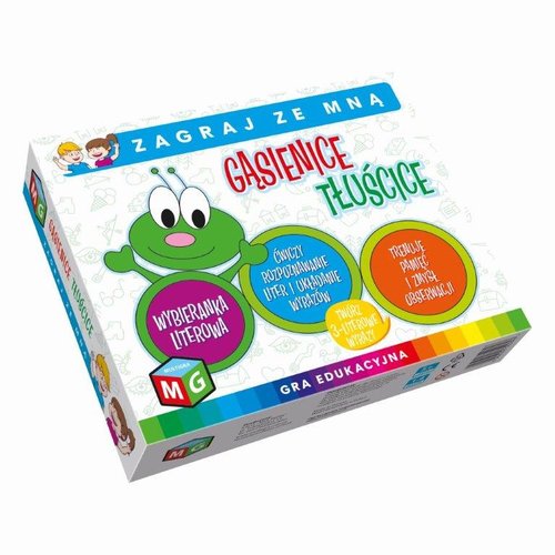 "Gąsienice tłuścice" to gradydaktyczna, która uczy dzieci tworzenia 3-literowych wyrazów, usprawnia analizę i syntezę fonemowąwyrazów oraz spostrzegawczość wzrokową. Zabawa polega na wybieraniu przez dziecko pierwszych liter z nazw obrazków prezentowanych przez gąsienice i tworzeniu z nich wyrazów. Proste i miłe dla oka rysunki ułatwiają poprawne rozpoznawanie i tworzenie wyrazów. Zawartość opakowania: plansze gąsienice - 16szt, tabliczki z obrazkami -16szt, instrukacja. Wiek graczy: 5+ Liczba graczy: 1-4