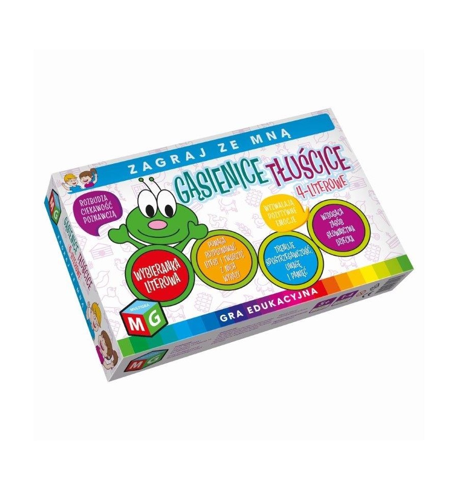 Gąsienice tłuścice"" to gra dydaktyczna, która uczy dzieci tworzenia 4-literowych wyrazów, usprawnia analizę i syntezę fonemową wyrazów oraz spostrzegawczość wzrokową. Zabawa polega na wybieraniu przez dziecko pierwszych liter z nazw obrazków prezentowanych przez gąsienice i tworzeniu z nich wyrazów. Proste i miłe dla oka rysunki ułatwiają poprawne rozpoznawanie i tworzenie wyrazów. Gra ćwiczy rozróżnianie i identyfikowanie liter. "" Gąsienice tłuścice"" to przyjemna gra edukacyjna, która łączy zabawę z nauką. Zestaw zawiera: plansze "" Gąsienice"" -16szt, tabliczki z obrazkami - 16szt, instrukcję.