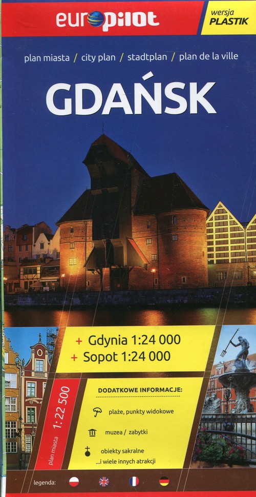 Plan miasta Gdańska w skali 1:22 500. Dodatkowe informacje: plaże, punkty widokowe muzea / zabytki obiekty sakralne i wiele innych atrakcji.