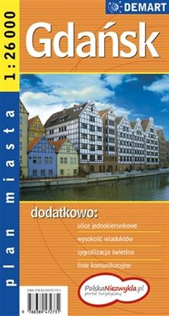 Plan Gdańska w skali 1:26 000 plus centrum w skali 1:10 000 wzbogacony o: - Ulice jednokierunkowe - Sygnalizacja świetlna - Linie komunikacyjne - Hipermarkety - Trasy i szlaki turystyczne - Spis ulic