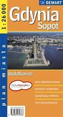 Plan miast Gdyni i Sopotu w skali 1: 26 000. Dodatkowo: ulice jednokierunkowe wysokość wiaduktów sygnalizacja świetlna linie komunikacyjne.