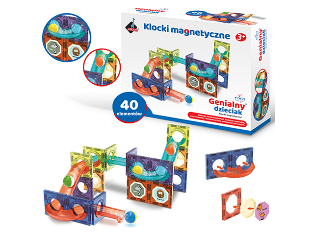Fantastyczne, unikatowe klocki magnetyczne rozwijające wyobraźnię, logiczne myślenie, dzięki czemu maluchy są bardziej kreatywne. Klocki posiadają silne magnesy o różnych kształtach, dające możliwość tworzenia fantastycznych figur, labiryntów, zjeżdżalni, którymi można puszczać piłeczki, znajdujące się w zestawie. Zestaw łączy w sobie zalety klocków magnetycznych i toru kulkowego. Klocki wykonane są z bardzo wysokiej jakości plastiku, mają piękne kolory, które mają wpływ na percepcję wzrokową. Dziecko uczy się figur geometrycznych, nie tylko odtwarza obrazy z instrukcji, ale także kojarzy fakty i samodzielnie dochodzi do wniosków, szuka podobieństw, tworzy własne konstrukcje. Zaczyna myśleć abstrakcyjnie. Jedynym ograniczeniem jest wyobraźnia małego konstruktora. Pamięć mechaniczna przekształca się w pamięć logiczną. Zabawa klockami wspomaga rozwój dzieci i jest doskonałym treningiem manualnym. Rozwija wyobraźnię, wspólne budowanie klocków z rodzicami czy innymi dziećmi uczy dzielenia się i współpracy.