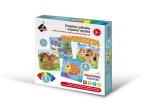 W zestawie są 4 obrazki, na które w odpowiednie miejsca należy nakleić piankowe elementy w kształcie kółka, kwadratu czy trójkąta, aby stworzyć piękne dzieło.