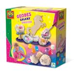Odkryj geody! Dzięki temu zestawowi SES Creative dzieci mogą odkrywać prawdziwe geody i eksponować je na drewnianym stojaku w kształcie jednorożca. Rozbij geody młotkiem i zacznij je dekorować. Dzięki sześciu kolorom farby dzieci mogą ozdobić geody różnymi zabawnymi kolorami. Te wspaniałe kryształy będą wyglądać jeszcze bardziej oszałamiająco! Pomaluj stojak, aby najlepsze kryształy znalazły się w eksponowanym miejscu na Twojej wystawie.