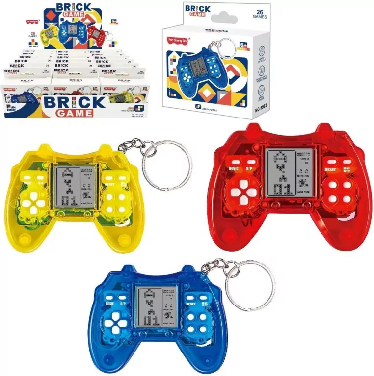 Mini Konsola Retro "Brick Game" - Klasyczna Rozrywka w Kieszonkowym Wydaniu! Przenieś się w czasie do złotej ery gier z naszą mini konsolą "Brick Game"! Ten kompaktowy gadżet w kształcie kontrolera to idealne połączenie nostalgii i przenośnej rozrywki, doskonałe dla każdego, kto pamięta klasyczne gry w układanie klocków. Cechy produktu: Klasyczna Rozrywka: Konsola oferuje 26 gier (wg opakowania "26 GAMES"), w tym najbardziej popularne warianty klasycznej gry w spadające klocki, zapewniając godziny wciągającej zabawy i ćwicząc refleks oraz logiczne myślenie. Design Retro: Stylizowana na kultowy kontroler, dostępna w trzech półprzezroczystych kolorach: żywym czerwonym, słonecznym żółtym i chłodnym niebieskim, które dodają jej uroku retro. Kompaktowy Rozmiar i Brelok: Dzięki niewielkim rozmiarom i dołączonemu kółku z brelokiem, konsolę można łatwo przypiąć do kluczy, plecaka czy torby, mając ją zawsze pod ręką, gotową do szybkiej rozgrywki w dowolnym miejscu i czasie. Intuicyjne Przyciski: Posiada wszystkie niezbędne przyciski do sterowania grą: kierunkowe (góra, dół, lewo, prawo), akcji, resetowania, włączania/wyłączania oraz przycisk do zarządzania muzyką/dźwiękiem (MUSIC S/P). Wyświetlacz LCD: Wyraźny monochromatyczny wyświetlacz LCD prezentuje grę w prosty, ale czytelny sposób, nawiązując do oryginalnych przenośnych konsol z lat 90. Idealny dla Każdego: Choć na opakowaniu widnieje sugerowany wiek "6+", prostota obsługi i uniwersalny charakter gier sprawiają, że to świetny gadżet dla dzieci, młodzieży, a także dorosłych, którzy chcą poczuć odrobinę nostalgii. Opakowanie Jednostkowe: Każda konsola jest zapakowana w estetyczne, kartonowe pudełko, co sprawia, że idealnie nadaje się na drobny upominek, nagrodę czy gadżet reklamowy. Zasilanie: Konsola działa na baterie (typ baterii nie jest wyszczególniony na widocznej części opakowania, zazwyczaj są to małe baterie guzikowe). Wielkość: 8x6x2 cm Idealny na: Drobny upominek dla dzieci i młodzieży. Gadżet dla miłośników retro gier. Zabawkę do zabicia czasu w podróży, w kolejce czy podczas przerw. Dodatek do paczki prezentowej. Wróć do korzeni cyfrowej rozrywki z naszą mini konsolą "Brick Game" i ciesz się klasyką w nowym, przenośnym wydaniu!