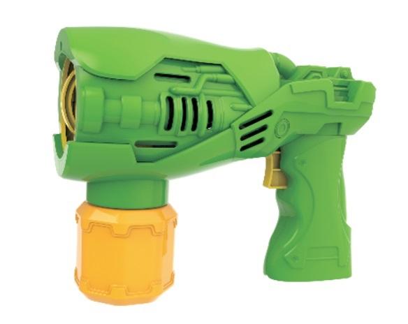 • wkręć butelkę z płynem do zabawki, a następnie naciśnij spust wyrzutni, a wystrzeli z niej strumień baniek;