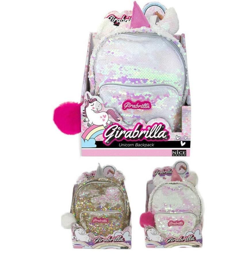 Cekinowy plecak z motywem jednorożca. Wykonany z materiału z odwracanymi cekinami. Zapinany na suwak, z przodu posiada jedną kieszeń.
