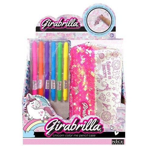 Ozdobny piórnik z Girabrilla Unicorn uszyty z materiału w odwracalne cekiny, a do tego można go kolorować! Część piórnika pokryta jest mieniącymi się cekinami, a część to symbole do kolorowania. W zestawie 6 flamastrów.