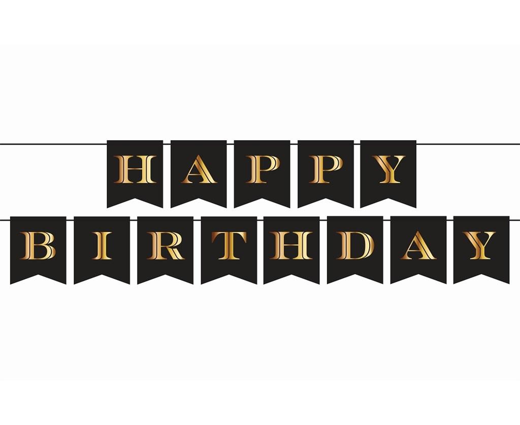 Girlanda papierowa Happy Birthday - B&G Party Kolor: czarny / złoty Napis: Happy birthday Ilość: 1 szt. Długość: 250 cm Kolekcja: Black & Gold Party Producent: Godan S.A.
