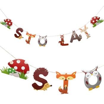 Girlanda papierowa na sznurku z motywem leśnych zwierząt. Zwierzątka układają się w litery tworząc napis "sto lat". Element dekoracyjny przyjęcia urodzinowego dla najmłodszych. Girlanda do samodzielnego złożenia. Całkowita długość girlandy to 250 cm. Produkt zaprojektowano w Polsce.