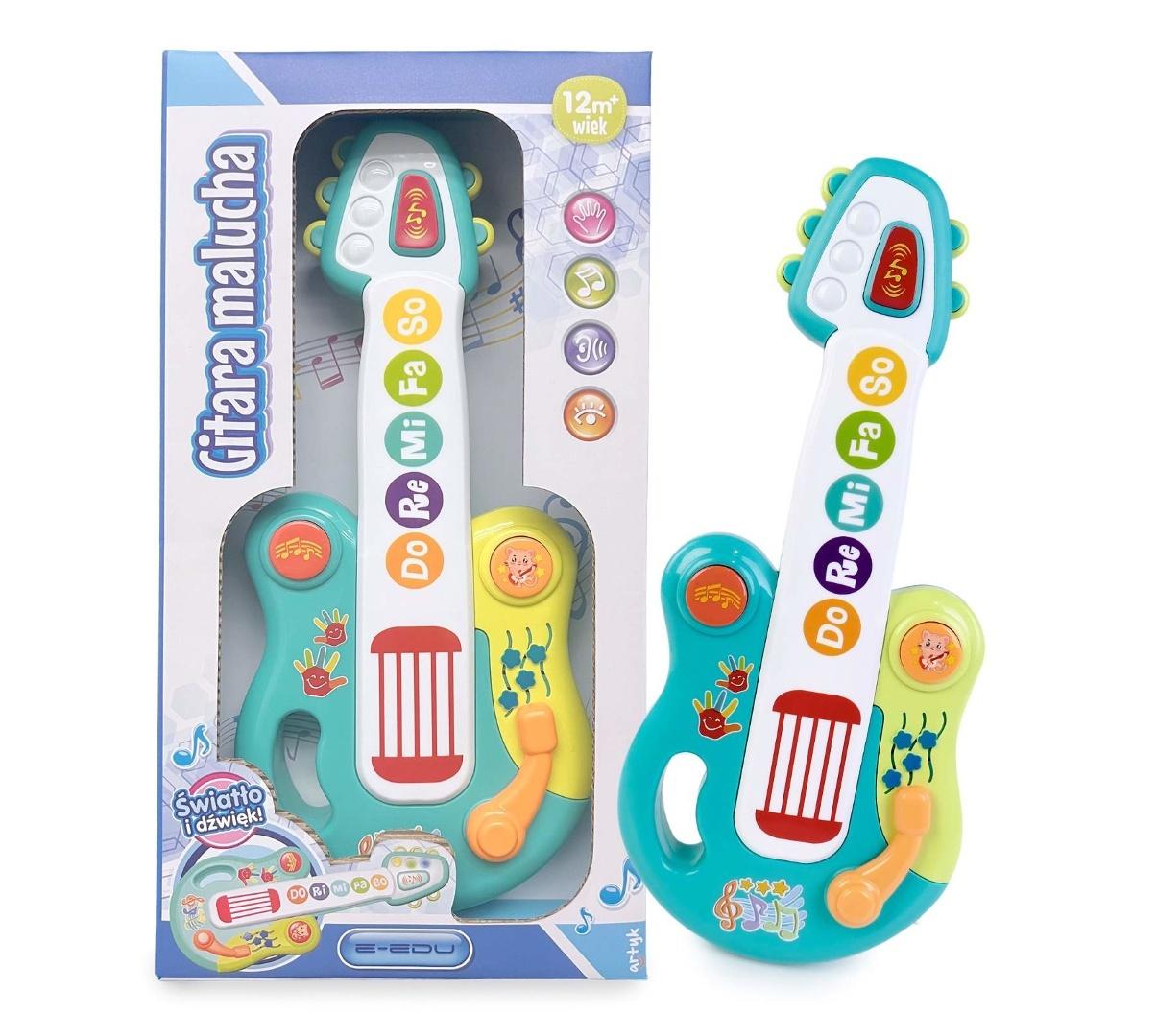 Funkcje: 3 tryby gry (przełączane poprzez pociągnięcie dźwigni): dźwięki gitary, pianina, dźwięki zabawne, instrumentalne ścieżki podkładowe, muzyka, przycisk strun aktywuje nuty gamy, podświetlany gryf, ruchome kółka do strojenia, regulacja głośności, wym. zabawki: 34 x 15 x 5 cm, wym. opak. 19 x 37,5 x 5,3 cm, baterie: 2 x AAA 1,5 V (brak w zestawie), 12 m+
