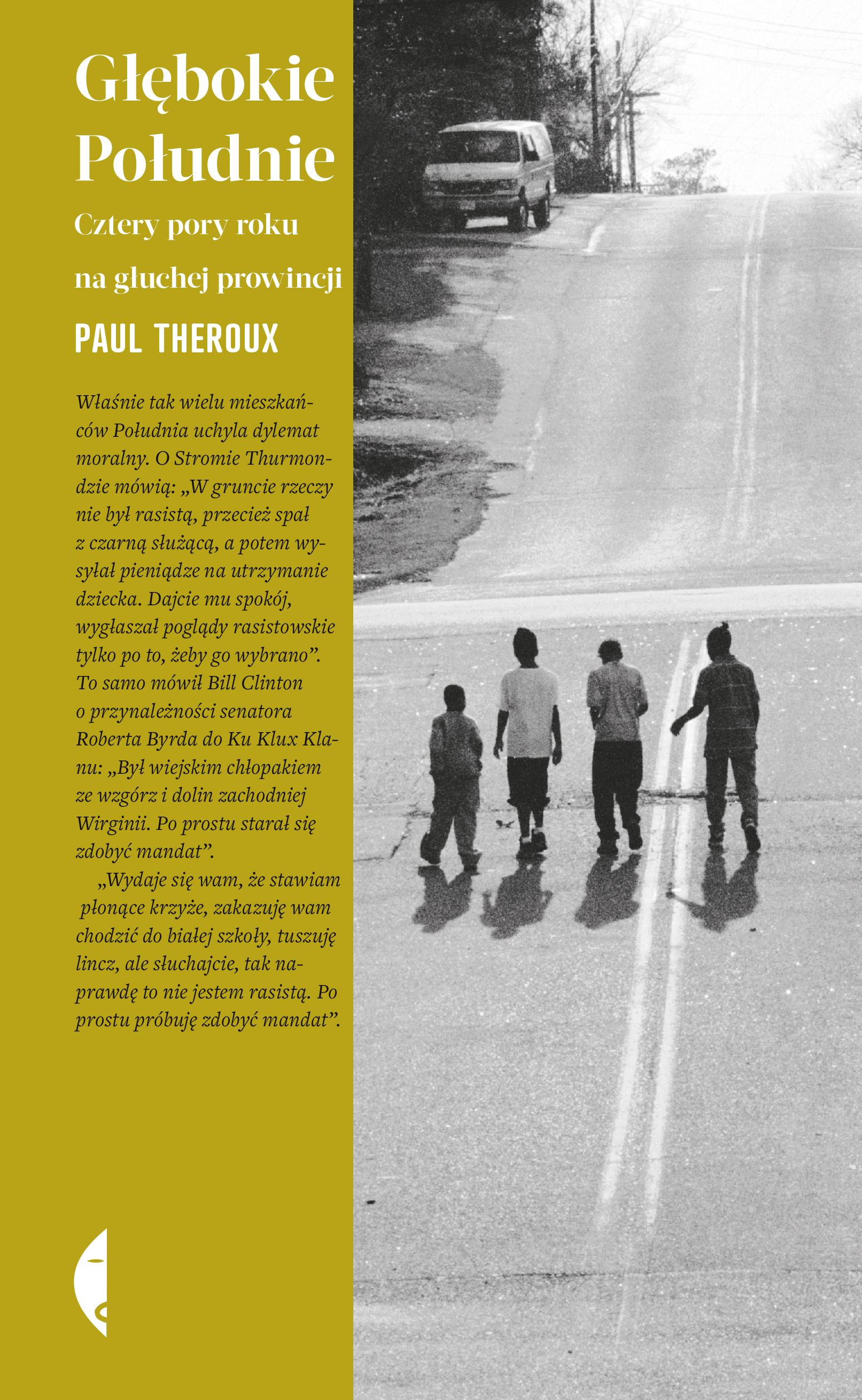 Głębokie Południe Paula Theroux to świat, w którym „historia żyje i ma się dobrze” – stosunki między czarnymi a białymi są wciąż napięte, pełne wzajemnych żalów i poczucia krzywdy: wielu zresztą wciąż pamięta czasy segregacji rasowej, a niektórzy twierdzą, że wcale się nie skończyły. Sercem wspólnoty jest tu lokalny kościół, ulubioną niedzielną rozrywką jarmark z bronią, którego uczestnicy zachowują się tak, jakby wojna secesyjna zakończyła się wczoraj. A wokół ciągną się pola bawełny, powoli wypieranej przez inne uprawy. Lecz choć Południe regularnie nawiedzają huragany, choć jest biedne, zacofane i popada w ruinę, równocześnie fascynuje muzyką, kuchnią, pogodą ducha i humorem. Theroux oburza się i pała gniewem, patrząc na nędzę i nierówności, ale podziwia wytrwałość i odwagę działaczy społecznych i zwykłych ludzi doświadczonych przez los. Jego opowieść ma też bohaterów drugoplanowych, znanych i mniej znanych kronikarzy Południa: Williama Faulknera, Mary Ward Brown, Marka Twaina, Carson McCullers, Tennessee Williamsa, którzy tak jak on próbowali zrozumieć i opisać fenomen tego świata. „Ta fascynująca książka to sedno podróży, próba uchwycenia ducha miejsca, jego historii, literatury, krajobrazu i odmienności. Theroux, podróżując niespiesznie, dekonstruuje mitologię amerykańskiego Południa i szuka napięć na głuchej prowincji. Zagląda do wsi i podupadłych miasteczek, a my razem z nim odwiedzamy plantacje bawełny, obdrapane stacje benzynowe, podłe motele, rozpalone gorliwością kaznodziejów kościoły i targi broni. Wsłuchujemy się w cichych bohaterów Południa i ich historie notowane w zakładach fryzjerskich i przydrożnych knajpach. Theroux opowiada nam więcej o Południu niż niejeden historyk.” Agnieszka Obszańska „Theroux mistrzowsko odsłania przed czytelnikiem prawdziwe oblicze amerykańskiego południa i jego mieszkańców. Znakomity dziennik z podróży.” „Kirkus Reviews” „Młode pokolenie autorów książek podróżniczych wiele zawdzięcza Paulowi Theroux. Wciągająca pierwszoosobowa narracja opisuje tu rzeczywistość z bezwzględną szczerością.” „New York Times Book Review” „W „Głębokim Południu” autor nie zachowuje dystansu, z którym dotąd opisywał świat. Świetlista, wspaniała – jedna z najlepszych książek Theroux od lat.” „Publishers Weekly”