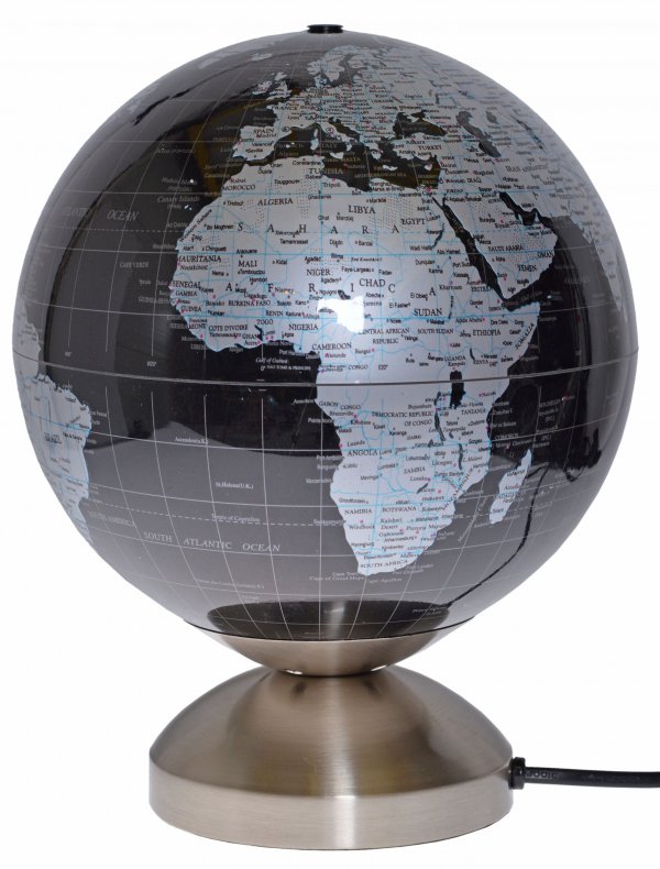 Globus podświetlany to świetny pomysł na lampkę na biurku lub szafce - wieczorową porą po włączeniu stworzy delikatną poświatę na globusie. Kabel czarny długości ok 1m.