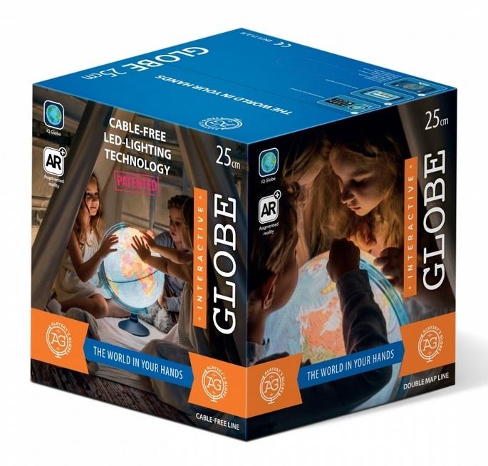 Globus Alaysky o średnicy 25 cm. Globus jest podświetlany, a do poprawnego funkcjonowania wymaga baterii – nie jest podłączany do kontaktu za pomocą kabla. Posiada dwie mapy nałożone na siebie – geograficzną i polityczną. Tym co go wyróżnia jest użycie nowoczesnych technologii – przy wyłączonym świetle na globusie widać mapę geograficzną. Po włączeniu światła LED pojawiają się informacje z mapy politycznej. Mapa geograficzna jest w 3D, dlatego dziecko może również uczyć się przez dotyk, obserwując i czytając to, co jest napisane na mapie. Aby poprawnie go złożyć, należy złączyć ze sobą dwie części, które łączą się na równiku. Dodatkowo, do globusa jest dołączona aplikacja, która pozwala na skanowanie konkretnych obszarów i pokazuje zwierzęta (w formie animacji) czy ciekawostki o danym terenie. Jest kilka wariantów, niektóre pozwalają na poznanie flory i fauny, krajów lub nawet przestrzeni kosmicznej. Darmowa aplikacja rzeczywistości rozszerzonej IQ Globe (9 tematów)