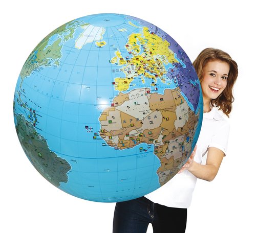 Olbrzymia i dekoracyjna kula ziemska dla pasjonatów i ciekawych świata. Starannie przemyślana grafika, najwyższej jakości nadruki, piękna kolorystyka, precyzyjna geografia i kartografia polityczna z flagami poszczególnych krajów czynią z tego produktu wyjątkowy produkt. Lekki jak powietrze globus pozwala na zabawę samemu lub w grupie. Można go też wyeksponować, zawieszając na przezroczystym haczyku lub umieszczając na nadmuchiwanej podstawie. Każdy kontynent ma swój własny kolor, ikony symbolizujące inną scenerię, a kompas pozwala z łatwością znaleźć kierunek. Piłka globus jest do nadmuchania, opakowanie nie zawiera pompki.