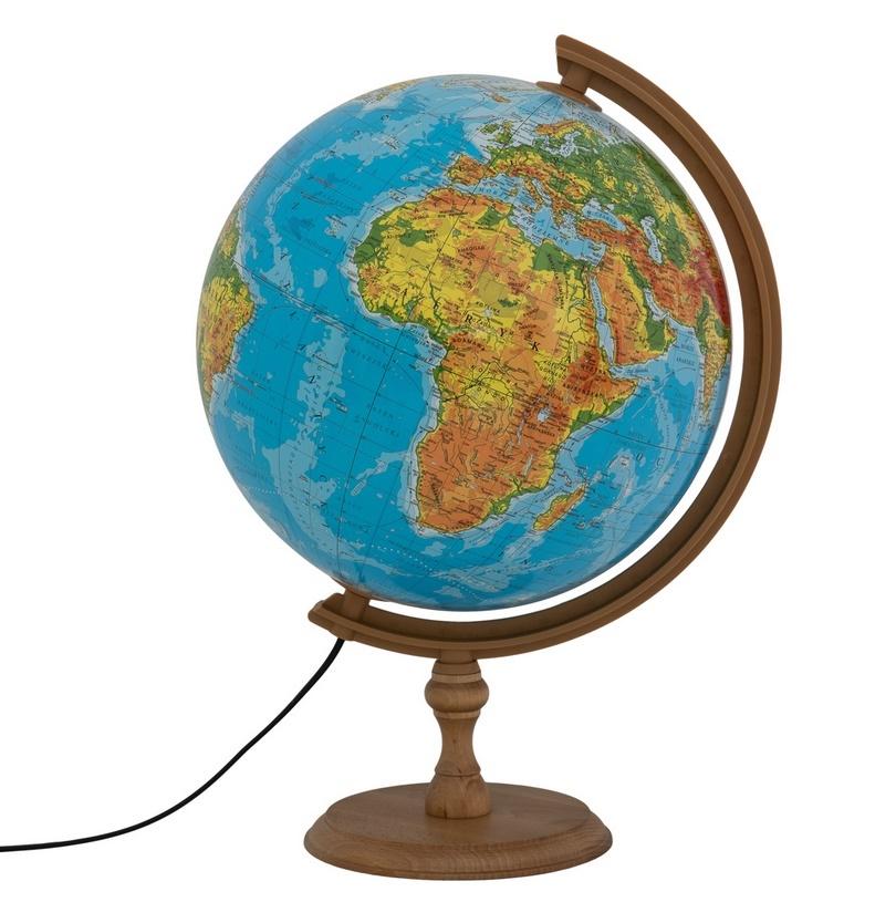 Globus 320 mm mapa fizyczna, cięciwa plastikowa, drewniana niska stopka.