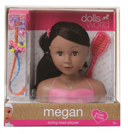 Głowa do stylizacji Megan. Zestaw zawiera: głowę lalki, szczotkę, spinki do włosów, koraliki, kolorowe warkoczyki, szczotkę i gumkę do włosów. Lalka dostępna w 2 wariantach - ciemnowłosa i blondynka.