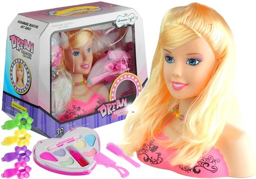 Głowa lalki do makijażu i czesania — różowa Niemal każda mała dziewczynka uwielbia wymyślanie i tworzenie szalonych makijaży i fryzur, nierzadko z wykorzystaniem produktów należących do starszych sióstr lub mam. Mamy na to ciekawe rozwiązanie, w związku z czym przedstawiamy doskonałą głowę lalki do stylizacji. Zabawka ta pozwoli małym dziewczynkom na wcielenie się w rolę wystrzałowej makijażystki i fryzjerki. Zabawkowa głowa lalki sprawi dziecku nie tylko ogromną frajdę, ale dodatkowo rozwinie wyobraźnię, kreatywności oraz poczucie estetyki. Pakiet akcesoriów do malowania i czesania lalki składa się z: - popiersia lalki, - wielokolorowych koralików na szyję na elastycznej gumce, - paletki cieni i szminki, - szczotki do włosów, - grzebienia do włosów - 4 sztuk spinek kwiatuszków na wsuwce, - gumki do włosów ozdobionej motylkiem, - kokardki z połyskującymi elementami. Lalka w różowym stroju została zaprojektowana w celu realizacji wszelkich pomysłów dzieciaków w kwestii wymyślnej stylizacji. Zabawkowa główka została wykonana z ogromną dbałością, co można zauważyć, zwracając uwagę na detale. Uśmiechnięta twarz lalki pokryta jest delikatnym makijażem, który stanowi bazę do dalszych zabiegów domowej wizażystki. Głowa lalki pokryta jest gęstymi włosami w kolorze ciepłego blondu — grzywka zaczesana jest na bok, natomiast na czubku głowy włosy związane są w modny, cienki kucyk. Różnorodne akcesoria dołączone do zestawu umożliwią oryginalnej stylistce wykonać nieograniczoną ilości ciekawych makijaży i fryzur. Znajdujący się w komplecie zestaw cieni do powiek i pomadka dają dziewczynce duże pole do popisu — paletka składa się z aż 5 różnych kolorów pigmentów do powiek oraz dwustronnej pacynki ułatwiającej nakładanie makijażu na oko. Połączenie koordynacji wzrokowo-ruchowej, a także pomysłowości sprawią, że na głowie lalki pojawią się wymyślne warkoczyki, koczki i inne fryzury. Solidna podstawa główki gwarantuje stabilność i komfort zabawy, nawet podczas intensywnego szczotkowania włosów lub nakładania makijażu. Dziecięca głowa przeznaczona jest do ćwiczeń tworzenia makijażu i fryzur, co zagwarantuje wszystkim małym dziewczynkom długie godziny spędzone na świetnej zabawie. Lalka będzie doskonałą niespodzianką dla kilku i nastolatek, które pasjonują się modą, a także uwielbiają naśladować swoje starsze koleżanki, siostry czy mamę. Zabawkowa głowa zapakowana jest w różowo-fioletowe pudełko z przeźroczystą witrynką, którego wnętrze zdobią różowe geometryczne wzory. Lalka wykonana jest z atestowanych i bezpiecznych materiałów, posiada certyfikat CE, dzięki czemu idealnie sprawdzi się w roli prezentu. Wymiary elementów zabawki dla wizażystki: - popiersie lalki: 23 cm x 10 cm x 23 cm, - paletka cieni do powiek: 12 cm x 10 cm x 2 cm, - szczotka: 11 cm x 1 cm, - grzebień: 11 cm, - spinka wsuwka: 8 cm, - kokarda: 10 cm x 6 cm. Wymiary opakowania głowy lalki: - 38 cm x 28,5 cm x 13,5 cm.
