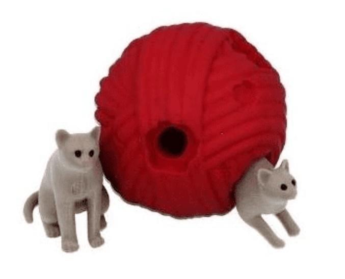 Kłębuszek posiada otworki do których wkładać można 2 szare kotki dołączone do zestawu. Wszystkie elementy wchodzące w skład zabawki są bardzo elastyczne i wytrzymałe. Kotek kłębek wełniany można rozciągać.