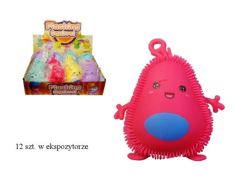 Gumowe świecące wesołe potworki. Po zderzeniu z podłożem świecą, a po ściśnięciu zmieniają swój kształt. Produkt występuje w kilku wersjach kolorystycznych, wybierany losowo. Cena dotyczy jednej sztuki. Podane wymiary są przykładowymi wymiarami potworka. Zabawka działa na baterie typu AG3/LR41. Baterie znajdują się w zabawce. Produkt zapakowany w przezroczysty worek.