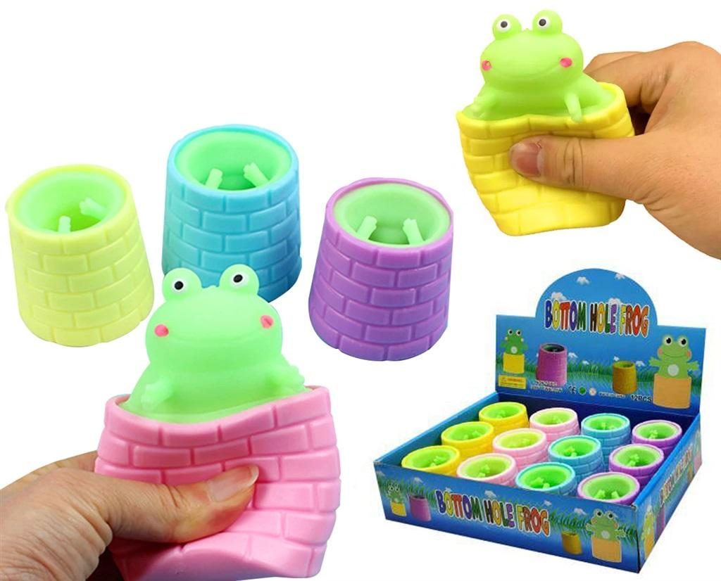 Gumowy gniotek żabka w studni. Po ściśnięciu gumowej studni z jej wnętrza wyskakuje żabka.