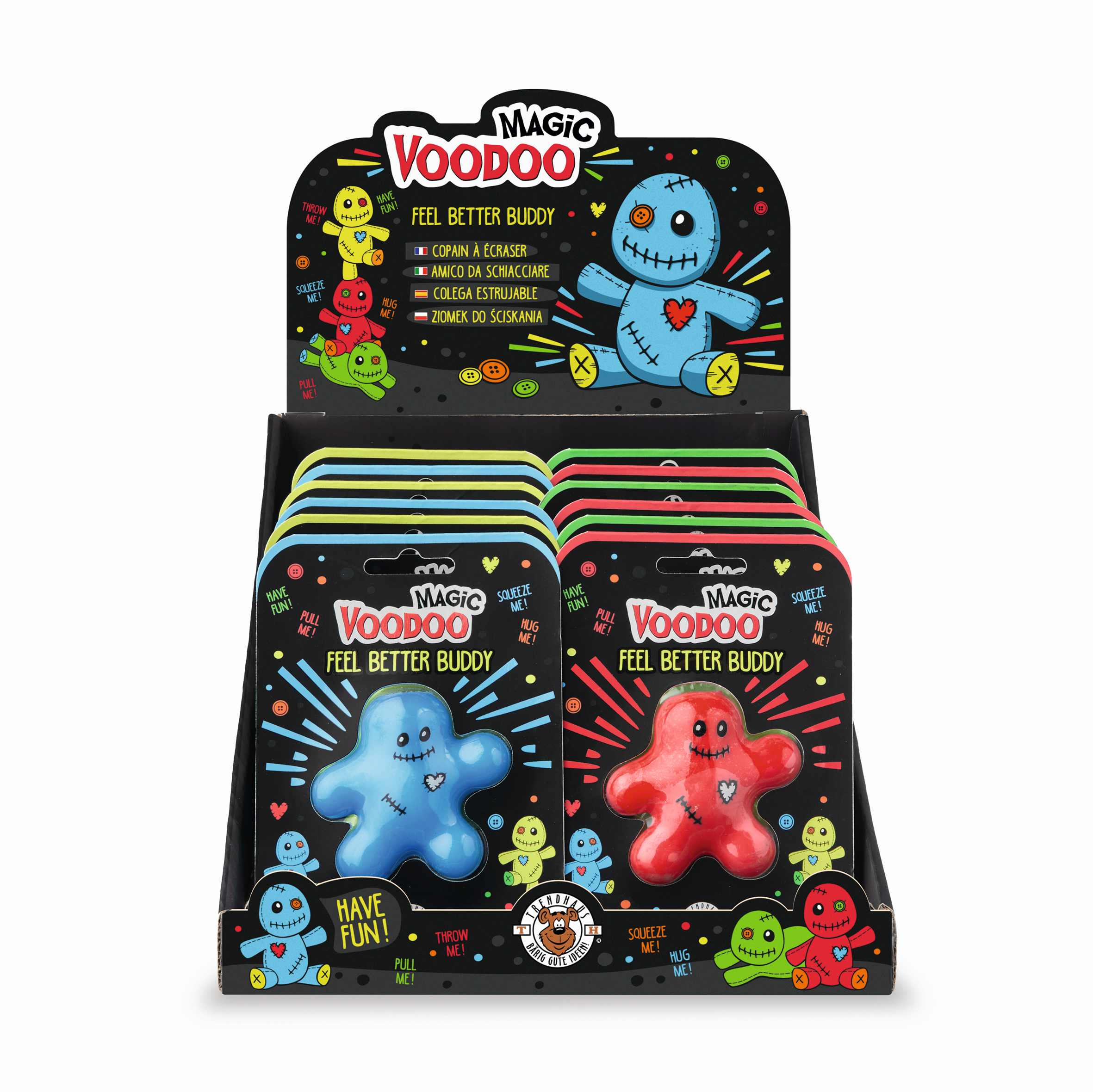 Ten dwustronny Voodoo Buddy z 2 różnymi minami (wesołą i smutną) jest idealny do rozciągania, ściskania i zabawy!