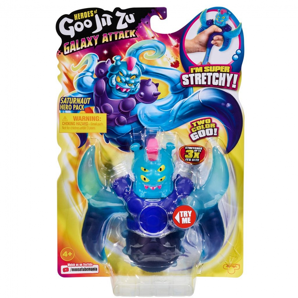 Bohaterowie Goo Jit Zu polecieli w kosmos, aby przeszukać galaktykę w poszukiwaniu początków Goo! Przygotuj się na akcję „Nie z tego świata” dzięki zupełnie nowej serii Galaxy Attack! Goo przeszło w Galaktykę, a niektórzy z twoich ulubionych bohaterów powracają, by walczyć z najdelikatniejszymi, najbardziej rozciągliwymi i najbardziej przerażającymi kosmitami we wszechświecie! Poznaj Saturnauta! Jeden z najbardziej rozciągliwych kosmitów we Wszechświecie, ten rozszerzalny Gooey facet ma kształt ciała i wygląd, który jest równie dziwny, jak rozciągliwy! W przeciwieństwie do innych postaci Goo Jit Zu, jest wypełniony niesamowitym dwukolorowym Goo! Ten galaktyczny zbir ma cztery oczy mocno utkwione w naszych bohaterach Goo Jit Zu i jest gotowy na atak obcych! Ściśnij i rozciągnij ręce i nogi Saturnauta, aby zobaczyć, jak jego niesamowita dwukolorowa Goo porusza się po jego ciele. Im więcej się z nim bawisz, tym bardziej mieszają się kolory! Heroes of Goo Jit Zu Galaxy Attack to zabawny sposób na zabawę dla dzieci figurkami akcji, które nie robią bałaganu. Te zabawki rozciągają się nawet trzykrotnie i są trwalsze niż kiedykolwiek wcześniej! Rozciągnij i zgniataj Saturnauta, a zawsze wróci do swojej pierwotnej formy! Ściskaj, ściskaj, rozciągaj i zbieraj wszystkie siedem nowych figurek Galaxy Attack! Czas dowiedzieć się, kto będzie rządził wszechświatem Gooey!