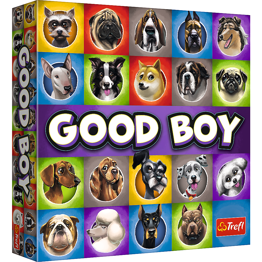 Good Boy marki Trefl to zabawna gra, w której przenosicie się do świata wesołych psiaków. Spotkacie tutaj najróżniejsze rasy z całego świata. Wasze zadanie polega na zbieraniu zabawek i łakoci, dzięki którym psy będą chciały się z Wami bawić. Uważajcie jednak na przebiegłe koty, które mogą popsuć nawet najlepszą zabawę. Gracz, który okaże się największym przyjacielem psiaków, wygrywa grę. Zawartość: 3 plansze podwórka, 28 kart psiaków, żeton pierwszego gracza, 2 kostki fantów, 60 żetonów fantów, 4 żetony psa/kota, instrukcja. Liczba graczy 2-4 Wiek 6+