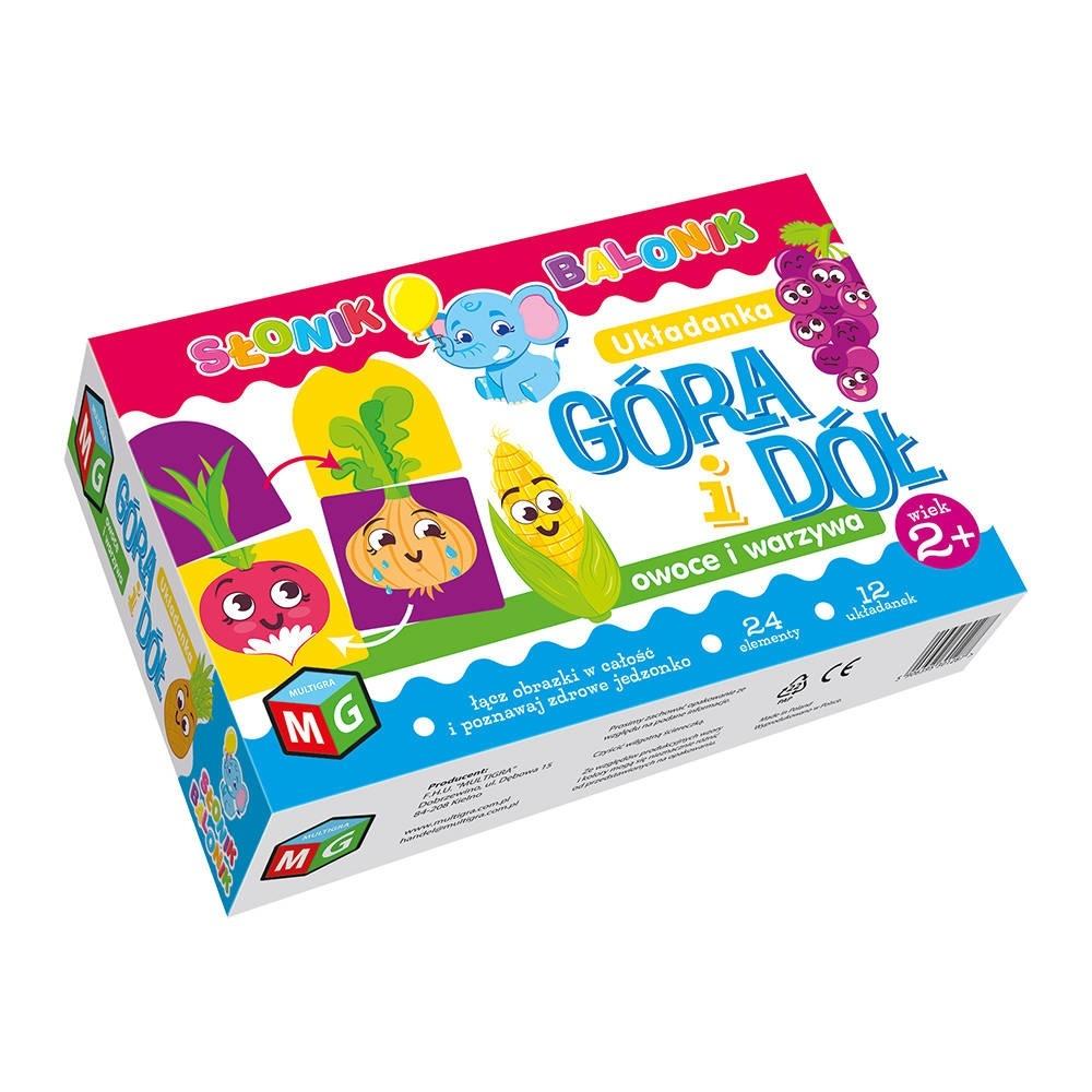 Słonik Balonik wychodzi naprzeciw potrzebom najmłodszych. Dzięki zastosowaniu dużych elementów z wysokiej jakości grubej tektury, dzieci z łatwością je chwytają, ćwicząc małą motorykę. Kolorowe obrazki rozbudzają w maluchach wyobraźnię, a zróżnicowane zadania świetnie wpływają na ich rozwój. Układanka góra i dół: owoce i warzywa to przyjemna zabawa dla maluchów i ich rodziców. Układaj uśmiechnięte warzywa, pamiętaj tylko, żeby się nie pomylić! Dopasuj górę marchewki do jej dołu. Ojej! A płacząca cebula? Przecież powinna mieć na głowie szczypiorek, a nie natkę! Proste i miłe dla oka ilustracje nie rozpraszają uwagi dziecka, dzięki czemu zabawa rozwija zdolność kojarzenia, dobierania w pary i spostrzegawczość. Kolorowe tła układanek ułatwiają ułożenie całej ilustracji. Elementy są wykonane z grubej tektury, a dzięki obłym kształtom całość jest przyjazna nawet dla małych dzieci.