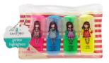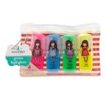 Komplet 4 mini zakreślaczy, umieszczonych w wodoszczelnej saszetce zamykanej na specjalny suwak. Każdy z zakreślaczy ozdobiony wizerunkiem innej Dziewczynki z kolekcji Gorjuss. Przydatne w szkole, biurze i w podróży. Zabezpieczone przed wodą. Do tworzenia pięknych i kolorowych "zakreślanek".